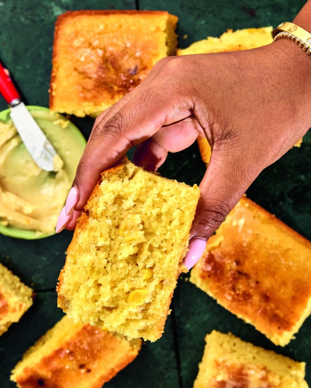 Make the corn bread: In a medium bowl, whisk together the cornmeal, flour, sugar, baking powder, and salt. In a small bowl, combine the milk, creamed corn, oil, and eggs and whisk until smooth. Make a well in the dry ingredients, then add the wet ingredients to the dry ingredients and stir until fully combined; some small lumps are okay.