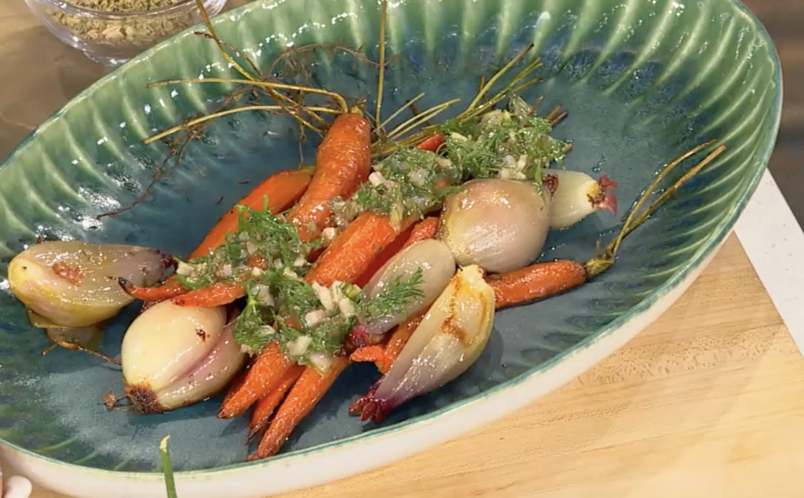 - Transfer the carrots and shallots to a large bowl. Squeeze the orange halves over them.